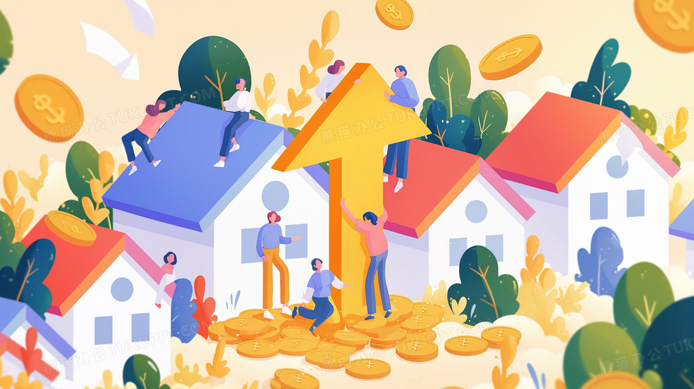 本作品内容为金币箭头房地产投资商务插画, 格式为 jpg, 大小3 MB, 图片尺寸为2912 x 1632, 源文件无水印, 欢迎使用熊猫办公。 如认为平台内容涉嫌侵权,可通过邮件:tousu@tukuppt.com提出书面通知,我们将及时处理。
