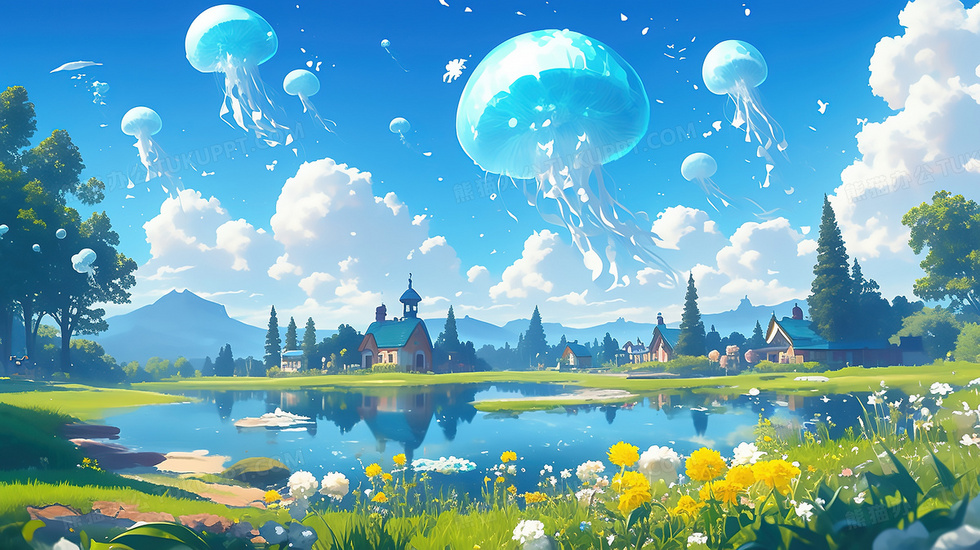 本作品内容为卡通唯美水母漂浮在空中梦幻插画, 格式为 jpg, 大小3 MB, 图片尺寸为2912 x 1632, 源文件无水印, 欢迎使用熊猫办公。 如认为平台内容涉嫌侵权,可通过邮件:tousu@tukuppt.com提出书面通知,我们将及时处理。