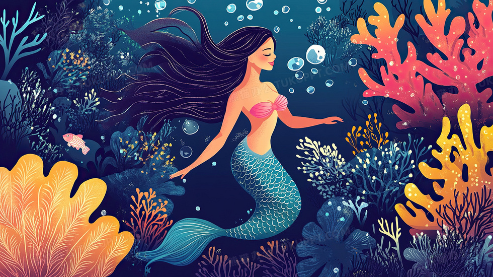首页 > 插画 > 科技艺术 > 矢量扁平 > 海底世界的美人鱼插画