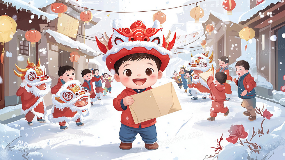 本作品内容为春节戴狮子帽送信的卡通小男孩插画, 格式为 jpg, 大小3 MB, 图片尺寸为2912 x 1632, 源文件无水印, 欢迎使用熊猫办公。 如认为平台内容涉嫌侵权,可通过邮件:tousu@tukuppt.com提出书面通知,我们将及时处理。