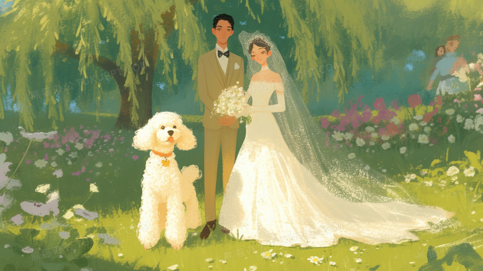 本作品内容为唯美风一对新人在草地拍婚纱照和宠物狗插画, 格式为 jpg, 大小3 MB, 图片尺寸为2912 x 1632, 源文件无水印, 欢迎使用熊猫办公。 如认为平台内容涉嫌侵权,可通过邮件:tousu@tukuppt.com提出书面通知,我们将及时处理。