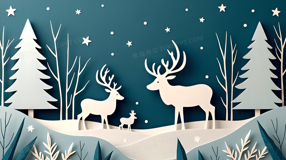 本作品内容为蓝白剪纸冬季驯鹿背景图, 格式为 jpg, 大小5 MB, 图片尺寸为3072 x 1728, 作品中背景图片无需修改, 源文件无水印,可以直接使用, 欢迎使用熊猫办公。 如认为平台内容涉嫌侵权,可通过邮件:tousu@tukuppt.com提出书面通知,我们将及时处理。