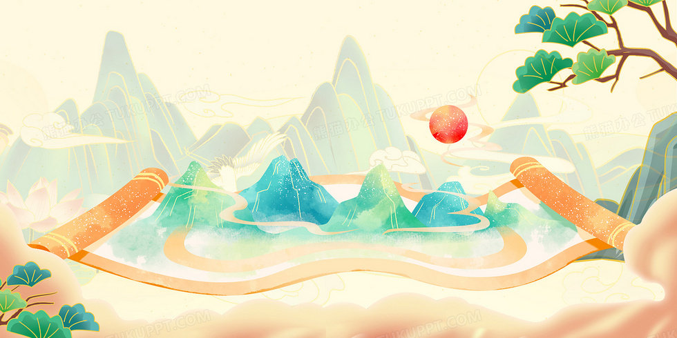 本作品内容为国潮山水风景画卷背景, 格式为 psd, 大小32 MB, 图片尺寸为4724 x 2362, 作品中背景图片无需修改, 源文件无水印,可以直接使用, 欢迎使用熊猫办公。 如认为平台内容涉嫌侵权,可通过邮件:tousu@tukuppt.com提出书面通知,我们将及时处理。
