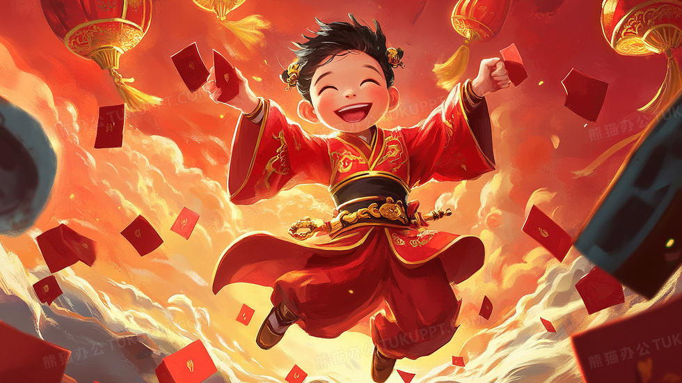 本作品内容为新年兴奋的孩子与红包压岁钱插画, 格式为 jpg, 大小4 MB, 图片尺寸为2912 x 1632, 源文件无水印, 欢迎使用熊猫办公。 如认为平台内容涉嫌侵权,可通过邮件:tousu@tukuppt.com提出书面通知,我们将及时处理。