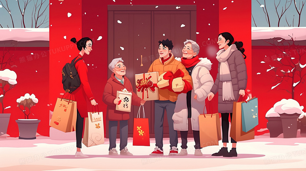本作品内容为春节拜年走亲友送礼的一家人插画, 格式为 jpg, 大小2 MB, 图片尺寸为2912 x 1632, 源文件无水印, 欢迎使用熊猫办公。 如认为平台内容涉嫌侵权,可通过邮件:tousu@tukuppt.com提出书面通知,我们将及时处理。