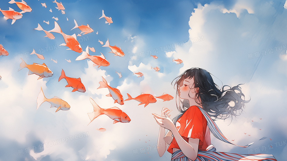 本作品内容为女孩踮起脚尖和空中的金鱼亲吻插画, 格式为 jpg, 大小7 MB, 图片尺寸为2912 x 1632, 源文件无水印, 欢迎使用熊猫办公。 如认为平台内容涉嫌侵权,可通过邮件:tousu@tukuppt.com提出书面通知,我们将及时处理。