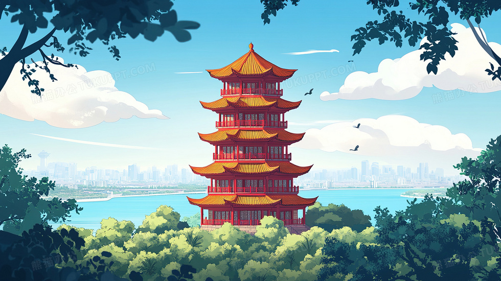 本作品内容为武汉黄鹤楼建筑插画, 格式为 jpg, 大小3 MB, 图片尺寸为2912 x 1632, 源文件无水印, 欢迎使用熊猫办公。 如认为平台内容涉嫌侵权,可通过邮件:tousu@tukuppt.com提出书面通知,我们将及时处理。