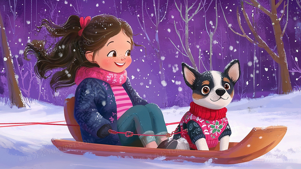 本作品内容为冬季坐雪橇滑雪的小女孩和宠物狗插画, 格式为 jpg, 大小3 MB, 图片尺寸为2912 x 1632, 源文件无水印, 欢迎使用熊猫办公。 如认为平台内容涉嫌侵权,可通过邮件:tousu@tukuppt.com提出书面通知,我们将及时处理。