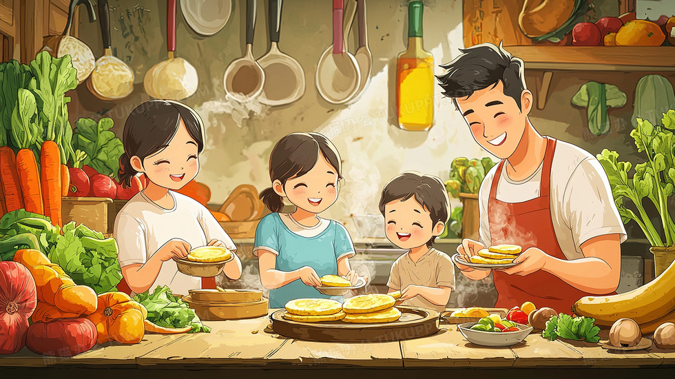 本作品内容为厨房忙碌做美食的一家人幸福插画, 格式为 jpg, 大小3 MB, 图片尺寸为2912 x 1632, 源文件无水印, 欢迎使用熊猫办公。 如认为平台内容涉嫌侵权,可通过邮件:tousu@tukuppt.com提出书面通知,我们将及时处理。