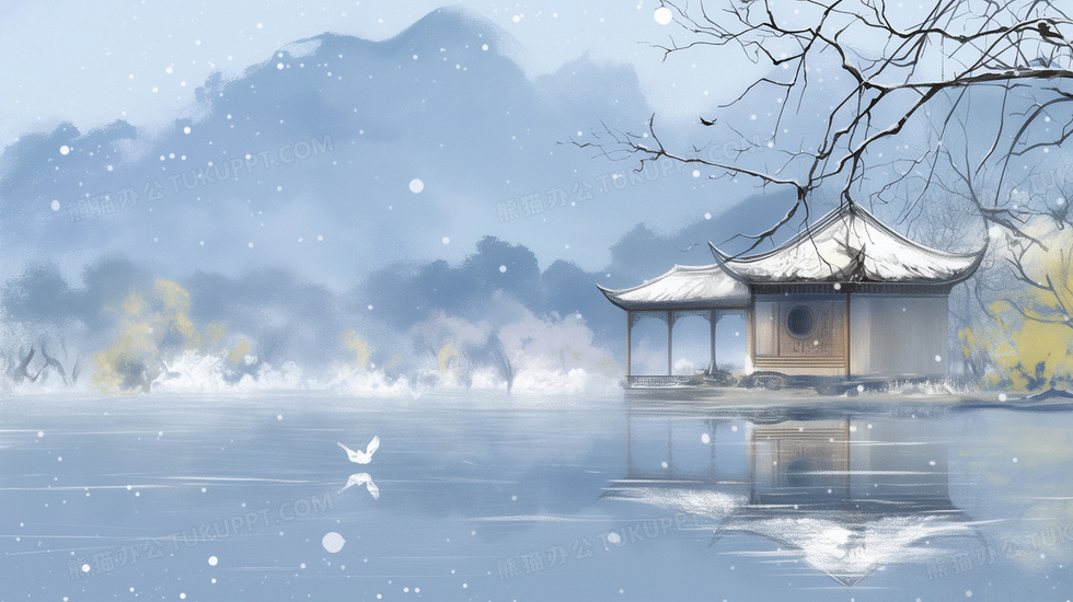 本作品内容为雪景映衬下的湖中心建筑插画, 格式为 jpg, 大小7 MB, 图片尺寸为2912 x 1632, 源文件无水印, 欢迎使用熊猫办公。 如认为平台内容涉嫌侵权,可通过邮件:tousu@tukuppt.com提出书面通知,我们将及时处理。