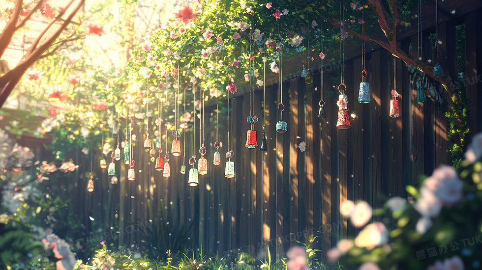 本作品内容为篱笆上挂着一串串风铃插画, 格式为 jpg, 大小3 MB, 图片尺寸为2912 x 1632, 源文件无水印, 欢迎使用熊猫办公。 如认为平台内容涉嫌侵权,可通过邮件:tousu@tukuppt.com提出书面通知,我们将及时处理。
