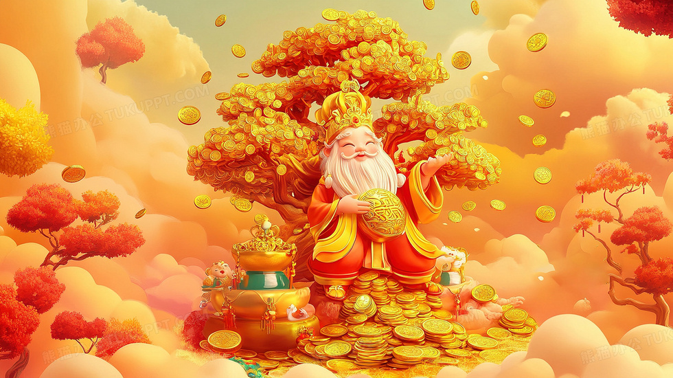 本作品内容为新年财神爷与摇钱树喜庆插画, 格式为 jpg, 大小4 MB, 图片尺寸为2912 x 1632, 源文件无水印, 欢迎使用熊猫办公。 如认为平台内容涉嫌侵权,可通过邮件:tousu@tukuppt.com提出书面通知,我们将及时处理。