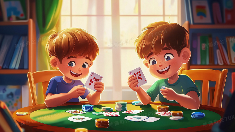 本作品内容为室内玩卡牌扑克的卡通男孩插画, 格式为 jpg, 大小3 MB, 图片尺寸为2912 x 1632, 源文件无水印, 欢迎使用熊猫办公。 如认为平台内容涉嫌侵权,可通过邮件:tousu@tukuppt.com提出书面通知,我们将及时处理。
