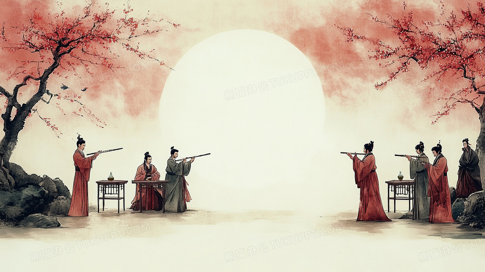 本作品内容为水墨风在花下作曲的古代文人背景, 格式为 jpg, 大小3 MB, 图片尺寸为2912 x 1632, 作品中背景图片无需修改, 源文件无水印,可以直接使用, 欢迎使用熊猫办公。 如认为平台内容涉嫌侵权,可通过邮件:tousu@tukuppt.com提出书面通知,我们将及时处理。