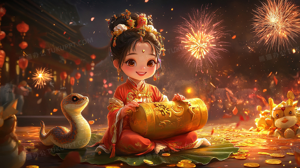 本作品内容为喜庆蛇年荷叶上抱金砖女孩与蛇烟花插画, 格式为 jpg, 大小4 MB, 图片尺寸为2912 x 1632, 源文件无水印, 欢迎使用熊猫办公。 如认为平台内容涉嫌侵权,可通过邮件:tousu@tukuppt.com提出书面通知,我们将及时处理。