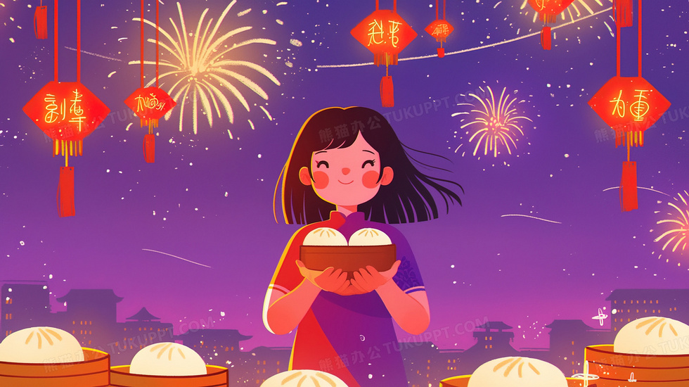 本作品内容为烟花喜庆春节手捧美食包子的女孩插画, 格式为 jpg, 大小3 MB, 图片尺寸为2912 x 1632, 源文件无水印, 欢迎使用熊猫办公。 如认为平台内容涉嫌侵权,可通过邮件:tousu@tukuppt.com提出书面通知,我们将及时处理。