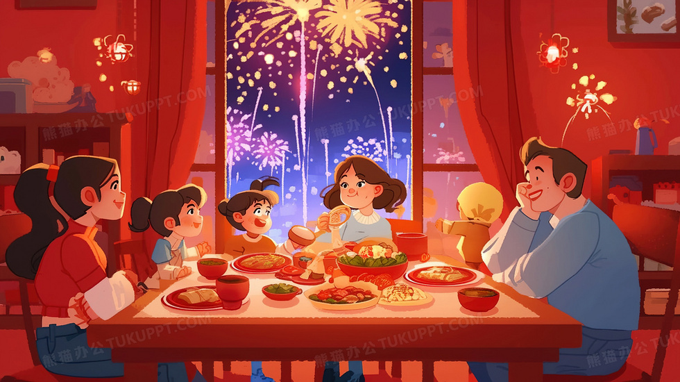 本作品内容为喜庆春节放烟花吃年夜饭的一家人插画, 格式为 jpg, 大小3 MB, 图片尺寸为2912 x 1632, 源文件无水印, 欢迎使用熊猫办公。 如认为平台内容涉嫌侵权,可通过邮件:tousu@tukuppt.com提出书面通知,我们将及时处理。
