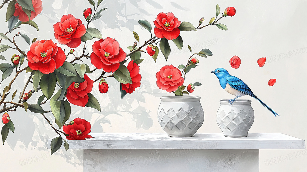 本作品内容为石凳上的唯美山茶花小鸟插画, 格式为 jpg, 大小3 MB, 图片尺寸为2912 x 1632, 源文件无水印, 欢迎使用熊猫办公。 如认为平台内容涉嫌侵权,可通过邮件:tousu@tukuppt.com提出书面通知,我们将及时处理。