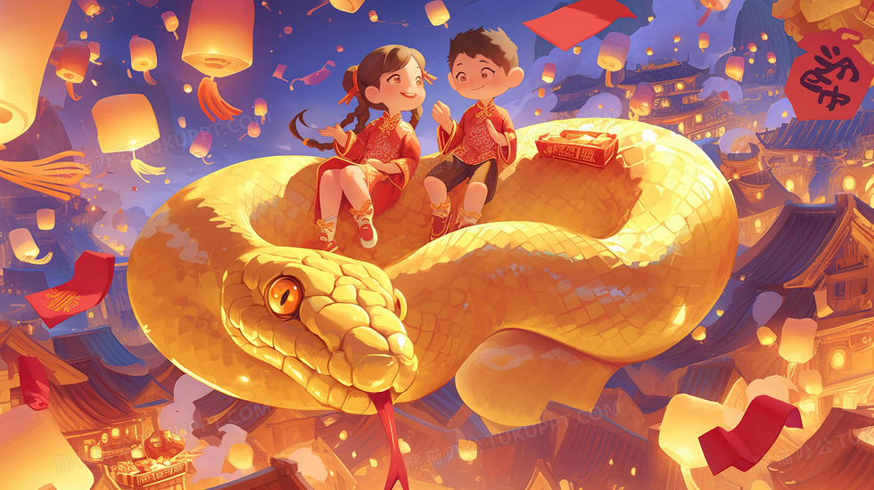 本作品内容为坐在金色蛇身上的孩子插画, 格式为 jpg, 大小3 MB, 图片尺寸为2912 x 1632, 源文件无水印, 欢迎使用熊猫办公。 如认为平台内容涉嫌侵权,可通过邮件:tousu@tukuppt.com提出书面通知,我们将及时处理。
