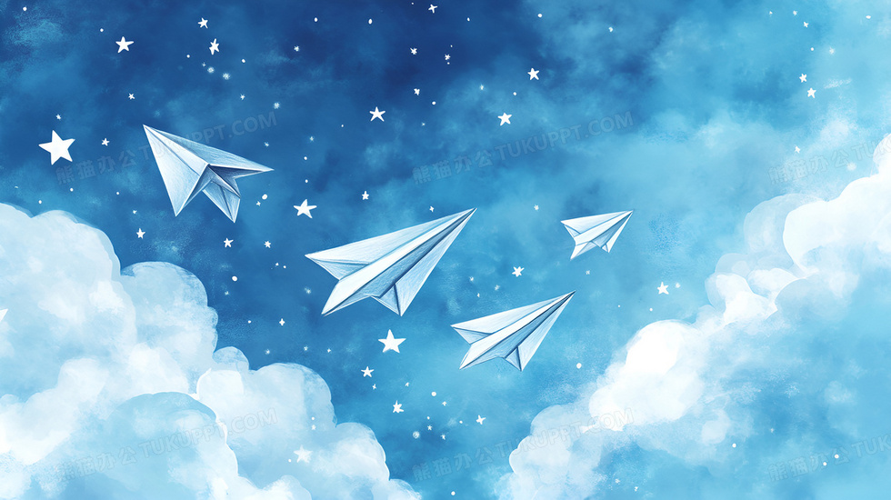 本作品内容为蓝色手绘纸飞机飞翔背景, 格式为 jpg, 大小2 MB, 图片尺寸为2912 x 1632, 作品中背景图片无需修改, 源文件无水印,可以直接使用, 欢迎使用熊猫办公。 如认为平台内容涉嫌侵权,可通过邮件:tousu@tukuppt.com提出书面通知,我们将及时处理。