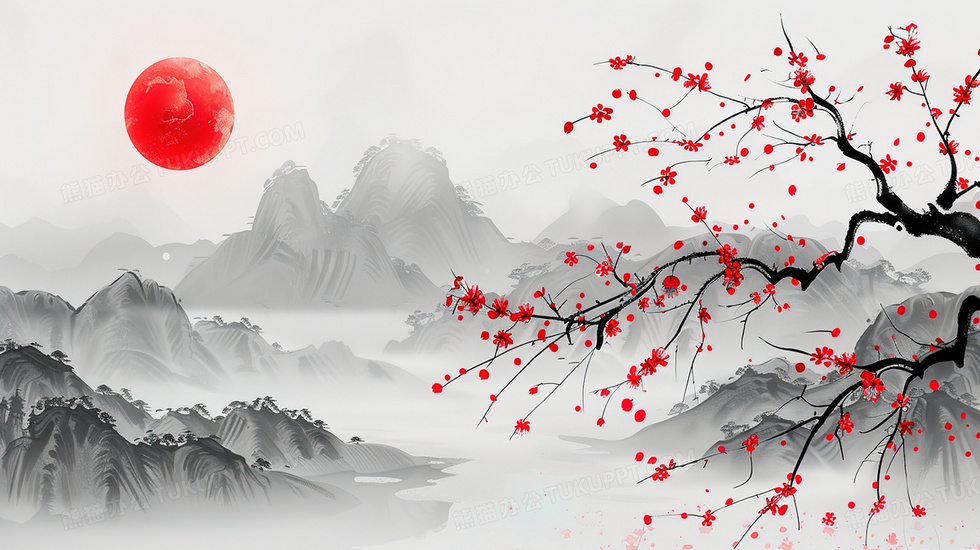本作品内容为水墨风梅花落日背景, 格式为 jpg, 大小3 MB, 图片尺寸为2912 x 1632, 作品中背景图片无需修改, 源文件无水印,可以直接使用, 欢迎使用熊猫办公。 如认为平台内容涉嫌侵权,可通过邮件:tousu@tukuppt.com提出书面通知,我们将及时处理。