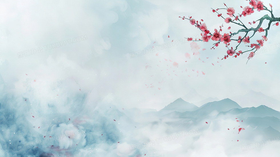 本作品内容为国风水墨梅花背景, 格式为 jpg, 大小3 MB, 图片尺寸为2912 x 1632, 作品中背景图片无需修改, 源文件无水印,可以直接使用, 欢迎使用熊猫办公。 如认为平台内容涉嫌侵权,可通过邮件:tousu@tukuppt.com提出书面通知,我们将及时处理。