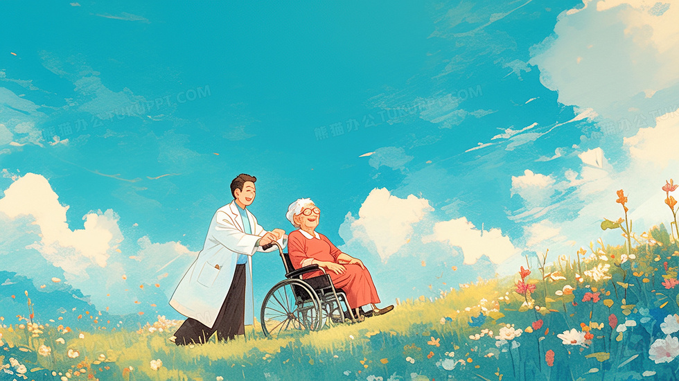 本作品内容为重阳节医生推坐轮椅的老人户外散步插画, 格式为 jpg, 大小4 MB, 图片尺寸为2912 x 1632, 源文件无水印, 欢迎使用熊猫办公。 如认为平台内容涉嫌侵权,可通过邮件:tousu@tukuppt.com提出书面通知,我们将及时处理。
