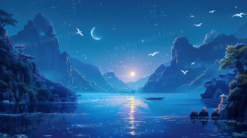 本作品内容为湖面山水月亮渔船背景, 格式为 jpg, 大小7 MB, 图片尺寸为2912 x 1632, 作品中背景图片无需修改, 源文件无水印,可以直接使用, 欢迎使用熊猫办公。 如认为平台内容涉嫌侵权,可通过邮件:tousu@tukuppt.com提出书面通知,我们将及时处理。