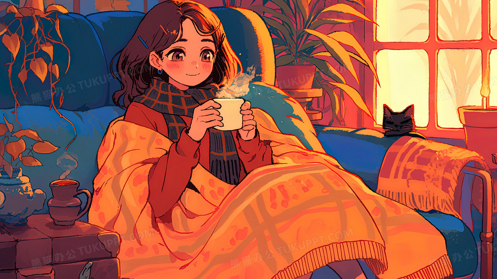 本作品内容为秋日宅家裹着毯子喝热茶的少女插画, 格式为 jpg, 大小3 MB, 图片尺寸为2912 x 1632, 源文件无水印, 欢迎使用熊猫办公。 如认为平台内容涉嫌侵权,可通过邮件:tousu@tukuppt.com提出书面通知,我们将及时处理。