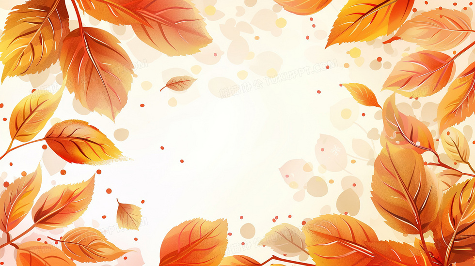 本作品内容为橙色秋季树叶边框背景, 格式为 jpg, 大小3 MB, 图片尺寸为2912 x 1632, 作品中背景图片无需修改, 源文件无水印,可以直接使用, 欢迎使用熊猫办公。 如认为平台内容涉嫌侵权,可通过邮件:tousu@tukuppt.com提出书面通知,我们将及时处理。
