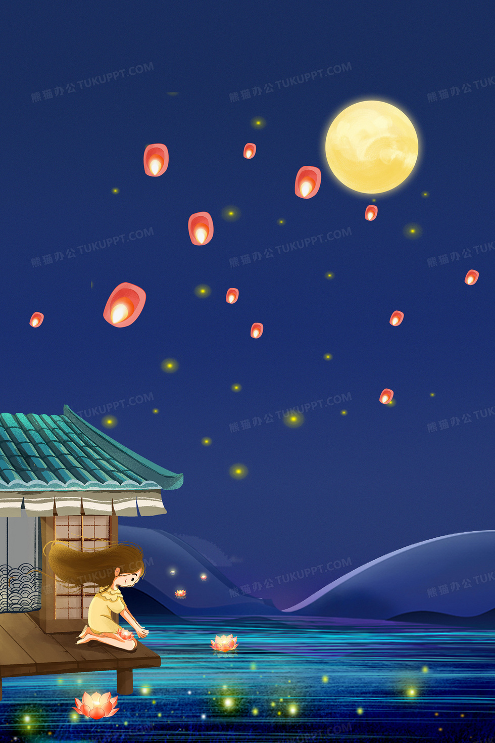 本作品内容为蓝色手绘中元节放灯合成背景, 格式为 psd, 大小79 MB, 图片尺寸为3543 x 5314, 作品中背景图片无需修改, 源文件无水印,可以直接使用, 欢迎使用熊猫办公。 如认为平台内容涉嫌侵权,可通过邮件:tousu@tukuppt.com提出书面通知,我们将及时处理。