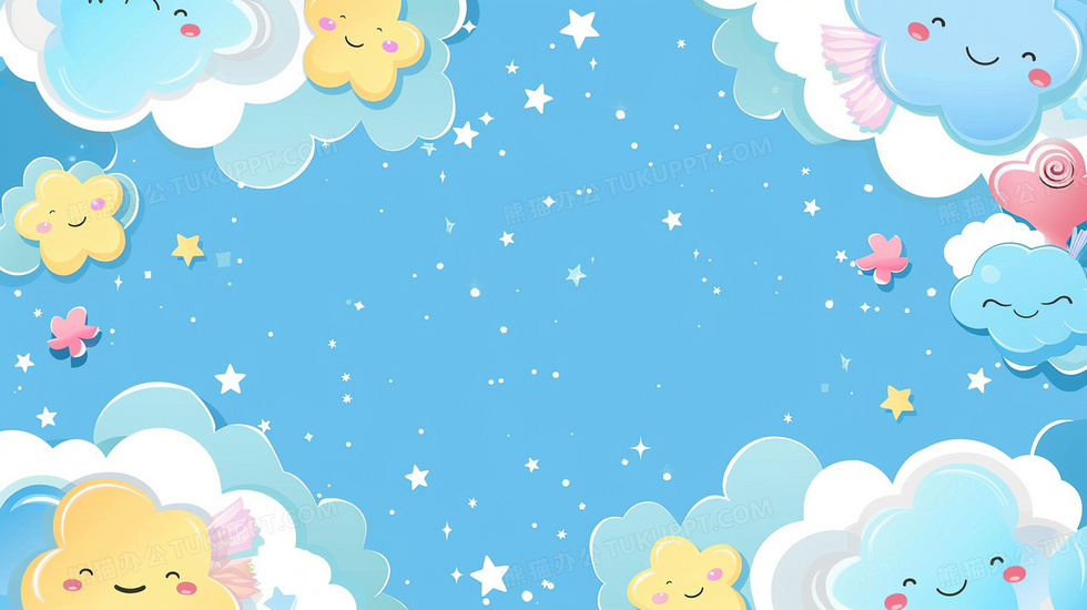 本作品内容为蓝色云朵卡通边框简约背景, 格式为 jpg, 大小2 MB, 图片尺寸为2912 x 1632, 作品中背景图片无需修改, 源文件无水印,可以直接使用, 欢迎使用熊猫办公。 如认为平台内容涉嫌侵权,可通过邮件:tousu@tukuppt.com提出书面通知,我们将及时处理。