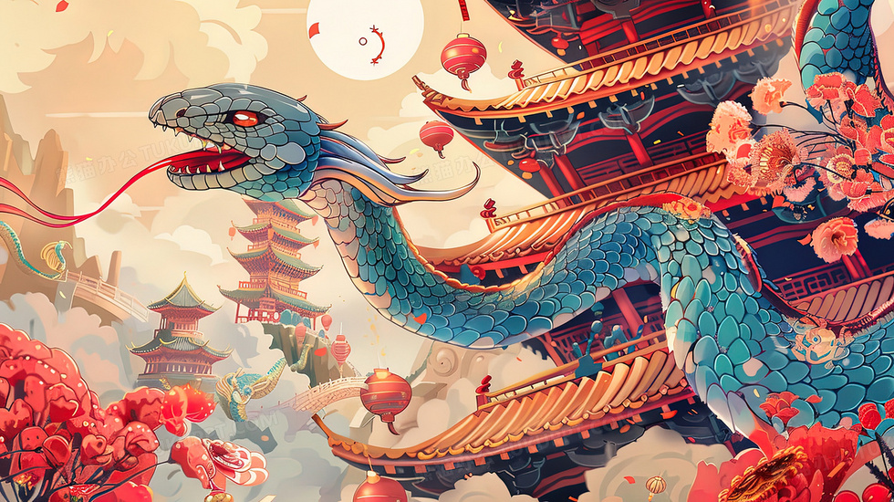 本作品内容为气势磅礴水墨蛇年中式建筑花卉插画, 格式为 jpg, 大小4 MB, 图片尺寸为2912 x 1632, 源文件无水印, 欢迎使用熊猫办公。 如认为平台内容涉嫌侵权,可通过邮件:tousu@tukuppt.com提出书面通知,我们将及时处理。