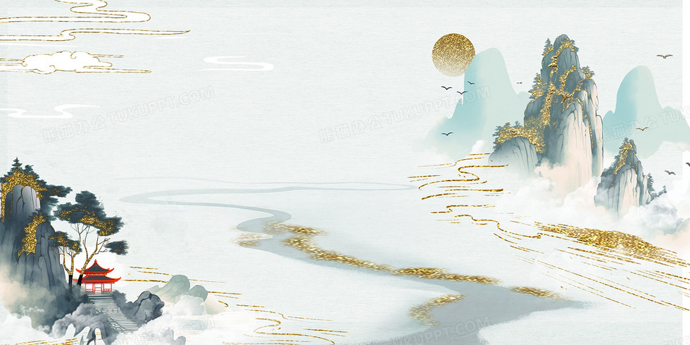 本作品内容为中国风水墨山水鎏金山水背景, 格式为 psd, 大小89 MB, 图片尺寸为4724 x 2362, 作品中背景图片无需修改, 源文件无水印,可以直接使用, 欢迎使用熊猫办公。 如认为平台内容涉嫌侵权,可通过邮件:tousu@tukuppt.com提出书面通知,我们将及时处理。
