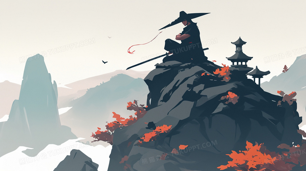 本作品内容为水墨山顶手拿剑的黑色侠客背景, 格式为 jpg, 大小2 MB, 图片尺寸为2912 x 1632, 作品中背景图片无需修改, 源文件无水印,可以直接使用, 欢迎使用熊猫办公。 如认为平台内容涉嫌侵权,可通过邮件:tousu@tukuppt.com提出书面通知,我们将及时处理。