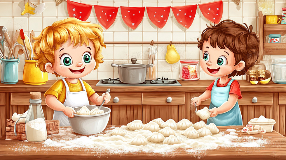本作品内容为卡通风格外国孩子们在捏面团包饺子的插画, 格式为 jpg, 大小3 MB, 图片尺寸为2912 x 1632, 源文件无水印, 欢迎使用熊猫办公。 如认为平台内容涉嫌侵权,可通过邮件:tousu@tukuppt.com提出书面通知,我们将及时处理。