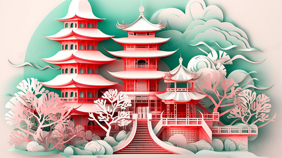 本作品内容为中国风红绿撞色亭台楼阁园林建筑创意剪纸插画, 格式为 jpg, 大小17 MB, 图片尺寸为8736 x 4896, 源文件无水印, 欢迎使用熊猫办公。 如认为平台内容涉嫌侵权,可通过邮件:tousu@tukuppt.com提出书面通知,我们将及时处理。