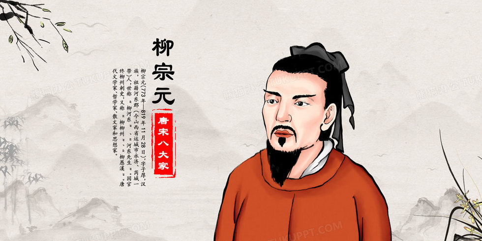 本作品内容为中国古代唐宋八大家之柳宗元人物介绍, 格式为 psd, 大小88 MB, 请使用软件PhotoShop(CC)打开, 源文件无水印, 欢迎使用熊猫办公。 如认为平台内容涉嫌侵权,可通过邮件:tousu@tukuppt.com提出书面通知,我们将及时处理。