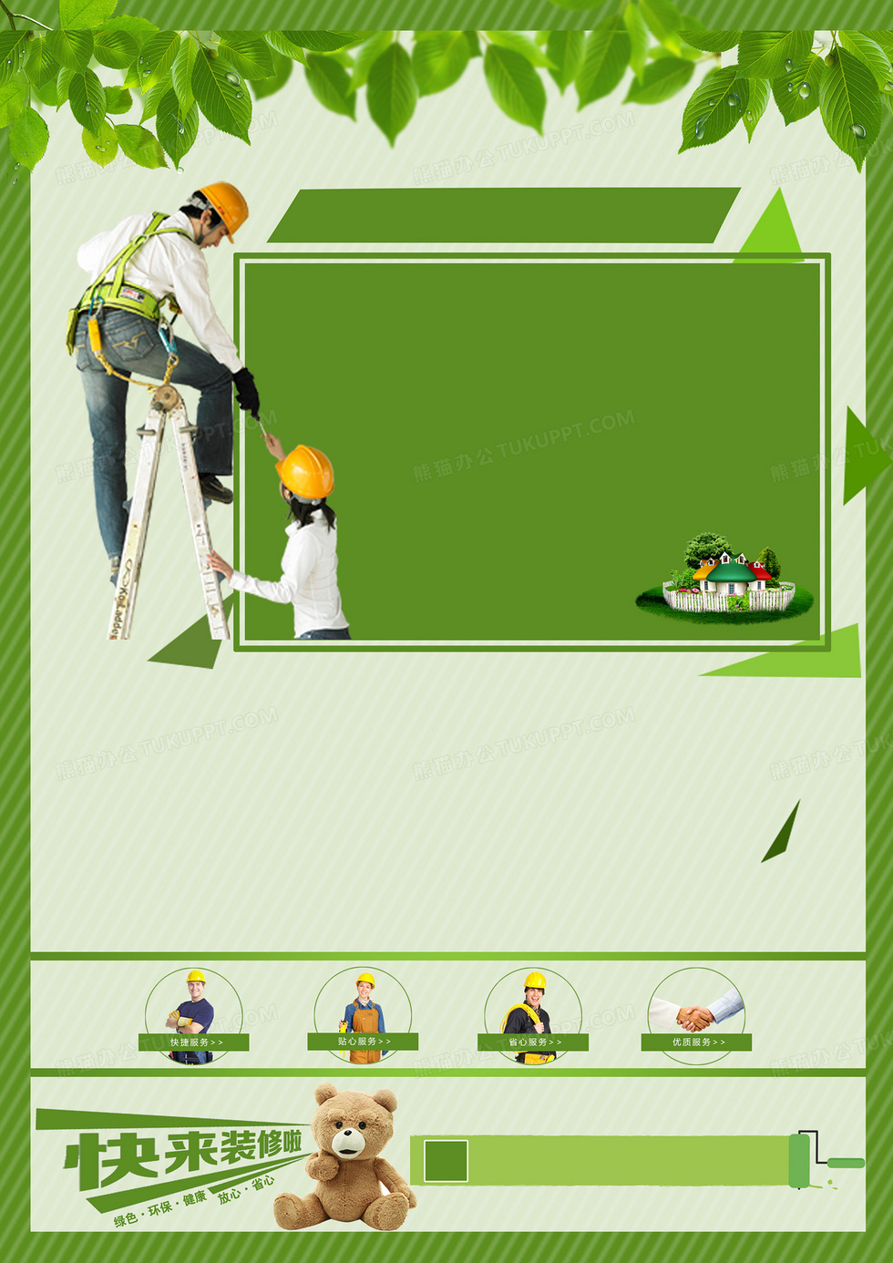 本作品内容为绿色清新装修广告背景, 格式为 psd, 图片尺寸为3508 x 4961, 作品中背景图片无需修改, 源文件无水印,可以直接使用, 欢迎使用熊猫办公。 如认为平台内容涉嫌侵权,可通过邮件:tousu@tukuppt.com提出书面通知,我们将及时处理。