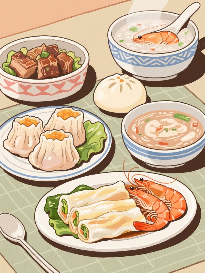 首页 > 插画 > 科技艺术 > 水彩手绘 > 早餐肠粉虾饺奶黄包豉汁排骨