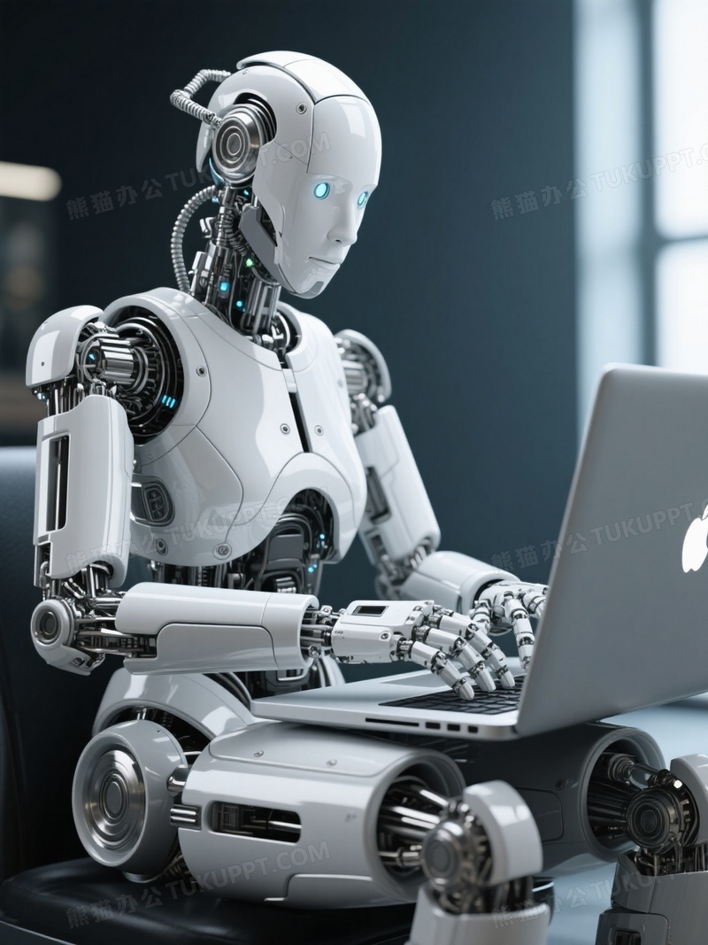 本作品内容为一个银白色机器人坐在坐在笔记本笔记本电脑前正在敲电脑, 格式为 jpg, 大小1 MB, 图片尺寸为1104 x 1472, 源文件无水印, 欢迎使用熊猫办公。 如认为平台内容涉嫌侵权,可通过邮件:tousu@tukuppt.com提出书面通知,我们将及时处理。