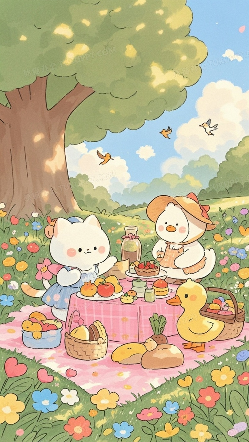 本作品内容为手绘插画一只可爱的小猫和小鸭子野餐, 格式为 jpg, 大小1 MB, 图片尺寸为1152 x 2048, 源文件无水印, 欢迎使用熊猫办公。 如认为平台内容涉嫌侵权,可通过邮件:tousu@tukuppt.com提出书面通知,我们将及时处理。