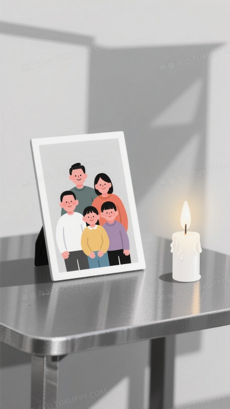 简约风卡通插画灰色的金属桌上摆放着一家五口的合影照片