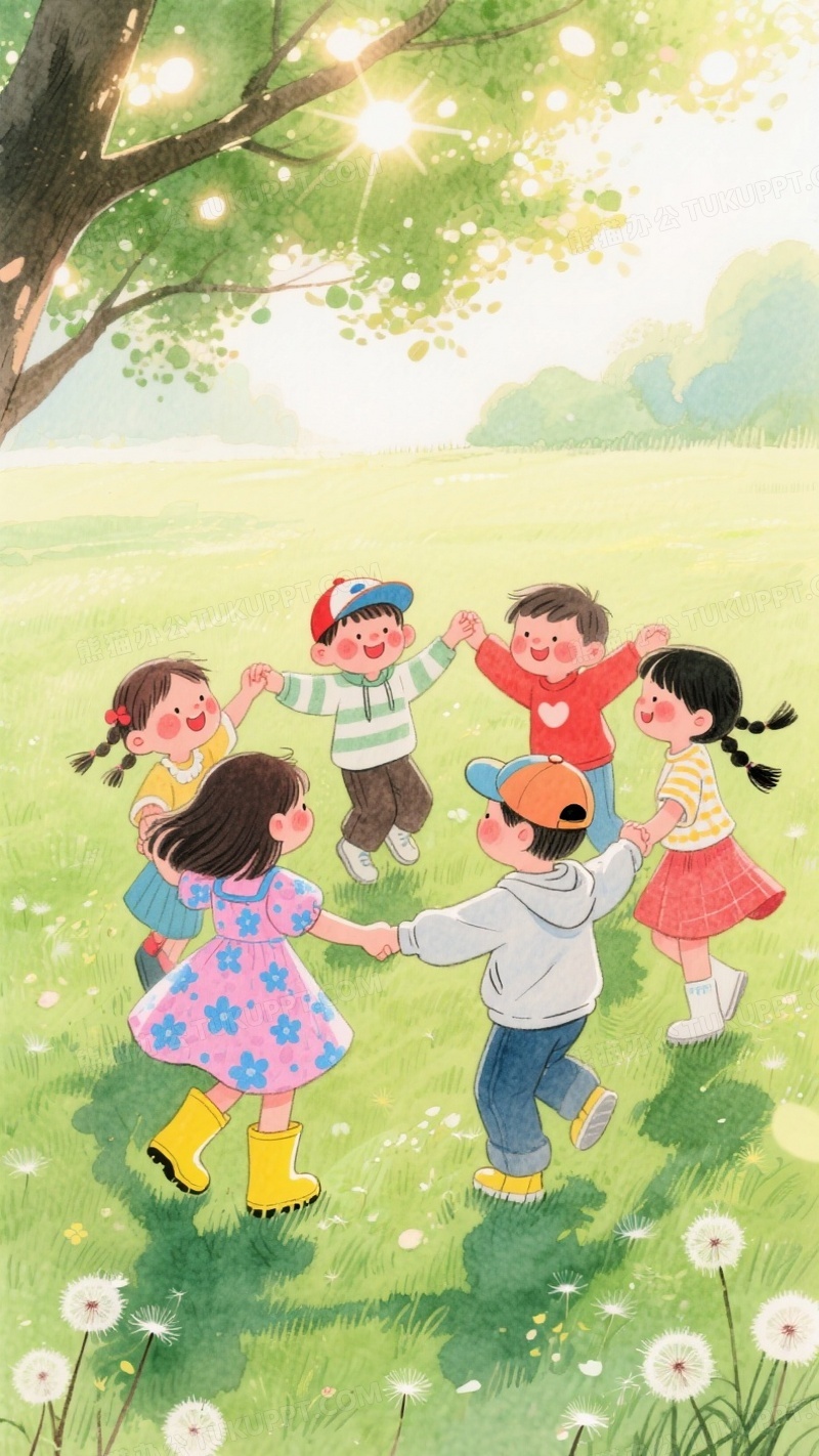 本作品内容为卡通风格插画五个小朋友手拉手围成圆圈跳舞, 格式为 jpg, 大小1 MB, 图片尺寸为936 x 1664, 源文件无水印, 欢迎使用熊猫办公。 如认为平台内容涉嫌侵权,可通过邮件:tousu@tukuppt.com提出书面通知,我们将及时处理。
