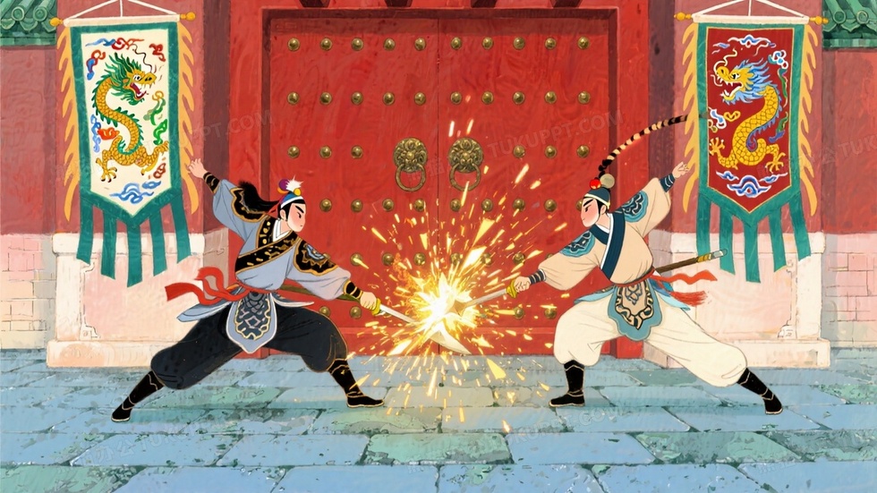 本作品内容为双武生对打全景插图兵器碰撞迸发鎏金火花, 格式为 jpg, 大小1 MB, 图片尺寸为1664 x 936, 源文件无水印, 欢迎使用熊猫办公。 如认为平台内容涉嫌侵权,可通过邮件:tousu@tukuppt.com提出书面通知,我们将及时处理。