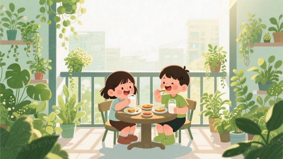 本作品内容为治愈系卡通插画小朋友在充满绿植的阳台吃早餐, 格式为 jpg, 大小1 MB, 图片尺寸为1664 x 936, 源文件无水印, 欢迎使用熊猫办公。 如认为平台内容涉嫌侵权,可通过邮件:tousu@tukuppt.com提出书面通知,我们将及时处理。