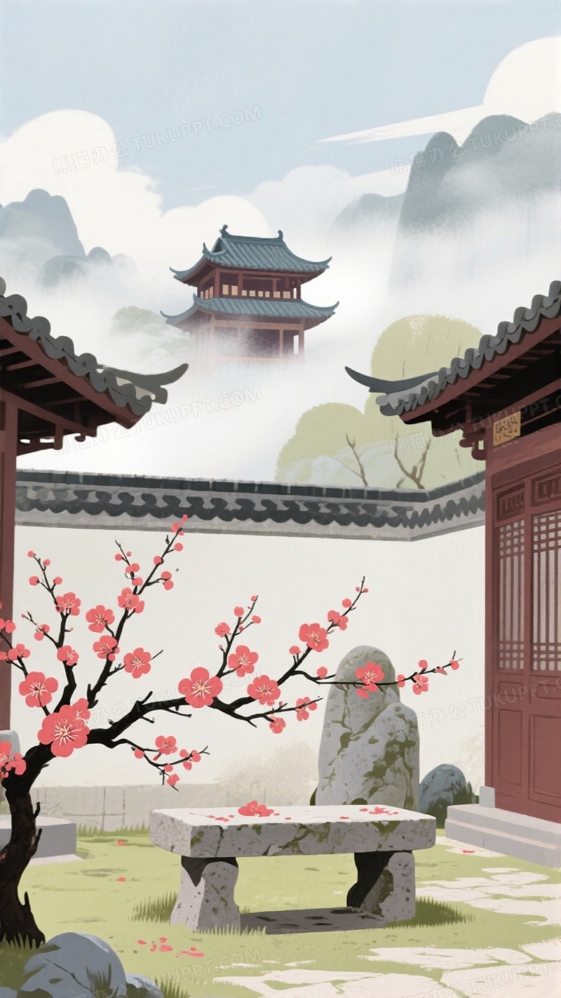 本作品内容为中式审美下的好看古风院子卡通插画, 格式为 jpg, 大小1 MB, 图片尺寸为936 x 1664, 源文件无水印, 欢迎使用熊猫办公。 如认为平台内容涉嫌侵权,可通过邮件:tousu@tukuppt.com提出书面通知,我们将及时处理。