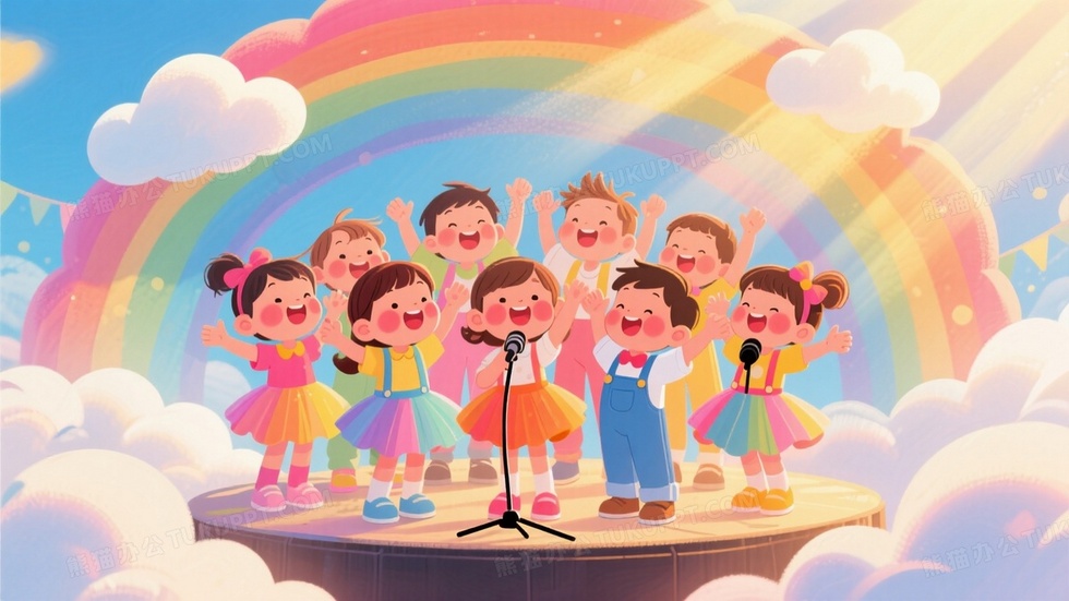 本作品内容为高清卡通插画一群可爱儿童站在彩色云朵搭成的舞台上欢快合唱, 格式为 jpg, 大小1 MB, 图片尺寸为1664 x 936, 源文件无水印, 欢迎使用熊猫办公。 如认为平台内容涉嫌侵权,可通过邮件:tousu@tukuppt.com提出书面通知,我们将及时处理。