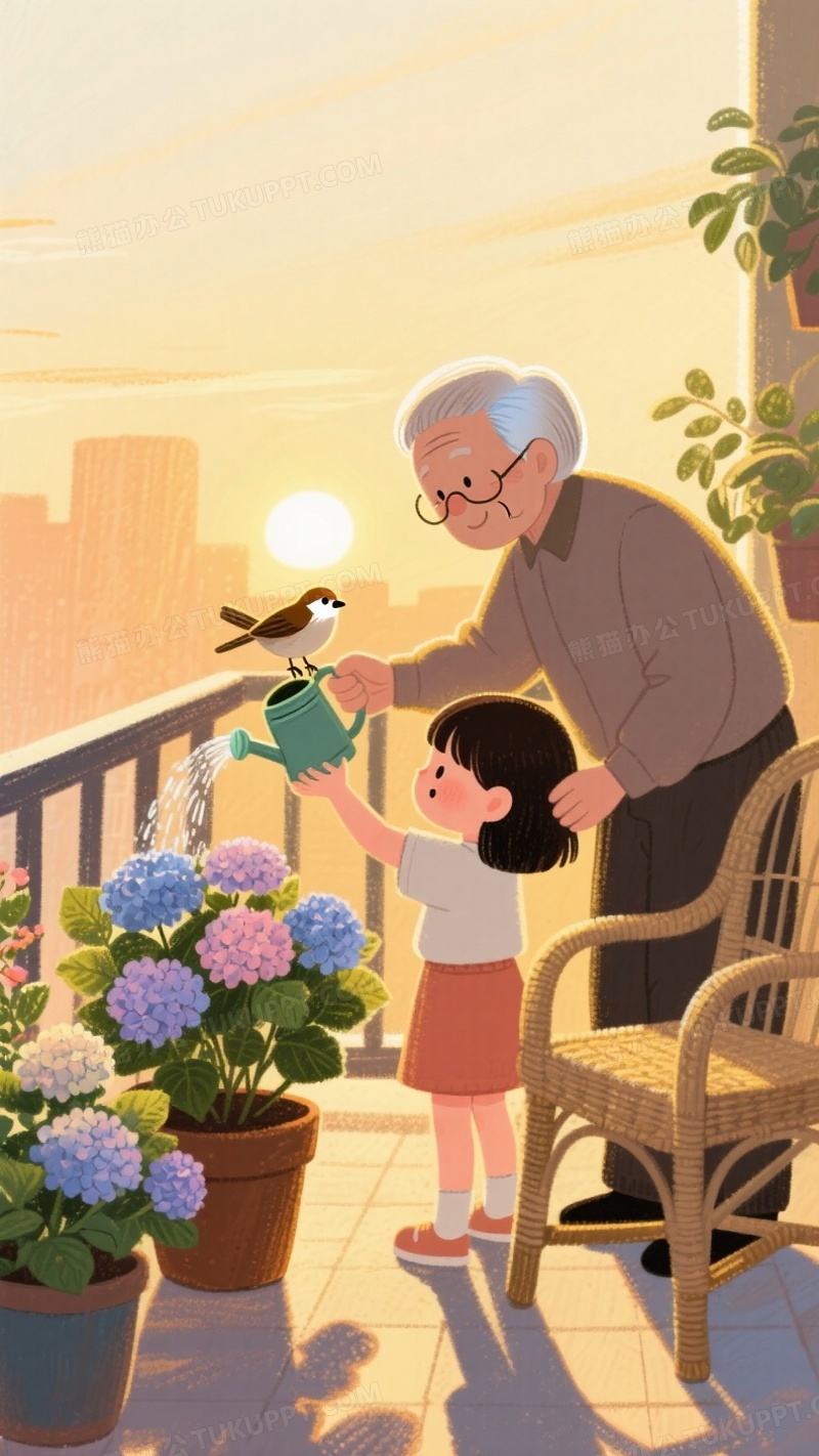 首页 > 插画 > 科技艺术 > 其他 > 温馨夕阳场景插画祖孙二人打理阳台绿植
