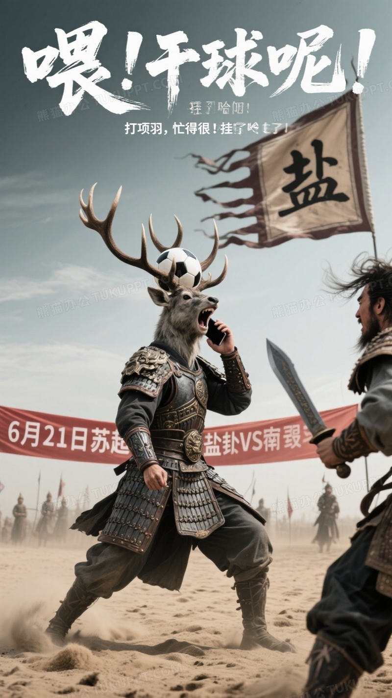 本作品内容为一名穿盔甲的头顶足球的麋鹿在沙场战斗, 格式为 jpg, 大小1 MB, 图片尺寸为936 x 1664, 源文件无水印, 欢迎使用熊猫办公。 如认为平台内容涉嫌侵权,可通过邮件:tousu@tukuppt.com提出书面通知,我们将及时处理。